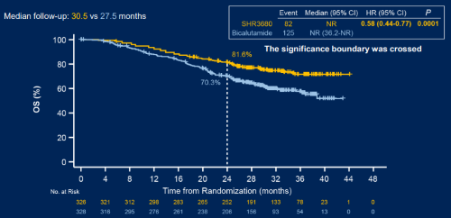 OS方面,截至2022年2月28日,SHR3680组与比卡鲁胺组的中位随访时间分别为30.5和27.5个月,24个月OS率分别为81.6%与70.3%,SHR3680组患者的OS显著延长,死亡风险降低了42%(图2)。